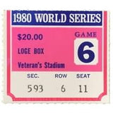 Featured is a 1980 World Series Game 6 ticket stub. The 1980 World Series matched the Philadelphia Phillies against the Kansas City Royals, with the Phillies winning in six games to capture the first of two World Series titles in franchise history to date. The series concluded after Game 6, which ended with Tug McGraw striking out Willie Wilson at 11:29 pm on October 21, 1980...