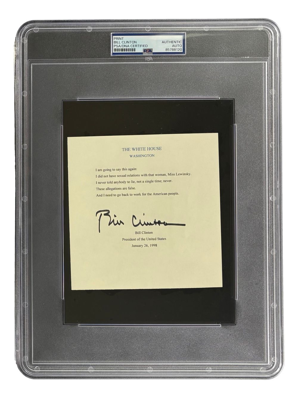 Featured is a Bill Clinton signed 5x6 Monica Lewinsky quote insert. This insert has been hand signed by Clinton and has been authenticated and encapsulated by PSA/DNA. This insert would be a great addition to any entertainment memorabilia collection!