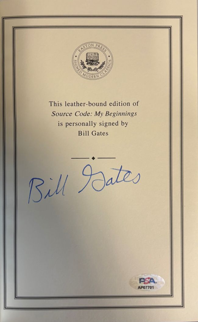 Featured is a Bill Gates signed Source Code: My Beginnings leather bound book. This book has been hand signed by Gates and comes with the PSA/DNA hologram and letter of authenticity. This book has been fully bound in leather and has 22kt gold deeply inlaid on the hubbed spine. This book features sewn pages and a satin-ribbon page marker. This book would make a great addition to any sports memorabilia collection!