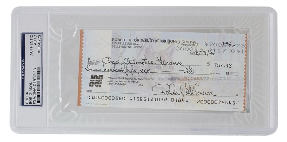Featured is a Bob Gibson signed slabbed St. Louis Cardinals bank check #1841. This check was hand signed by Bob Gibson and slabbed and authenticated by PSA/DNA authentication services. This item would make a great addition to any sports memorabilia collection...
