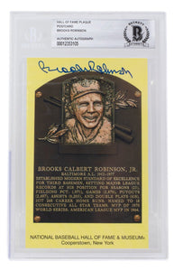 Featured is a Brooks Robinson signed Baltimore Orioles hall of fame plaque post card. This post card was hand signed by Brooks Robinson and slabbed and authenticated by Beckett grading services. This item would make a great addition to any sports memorabilia collection..
