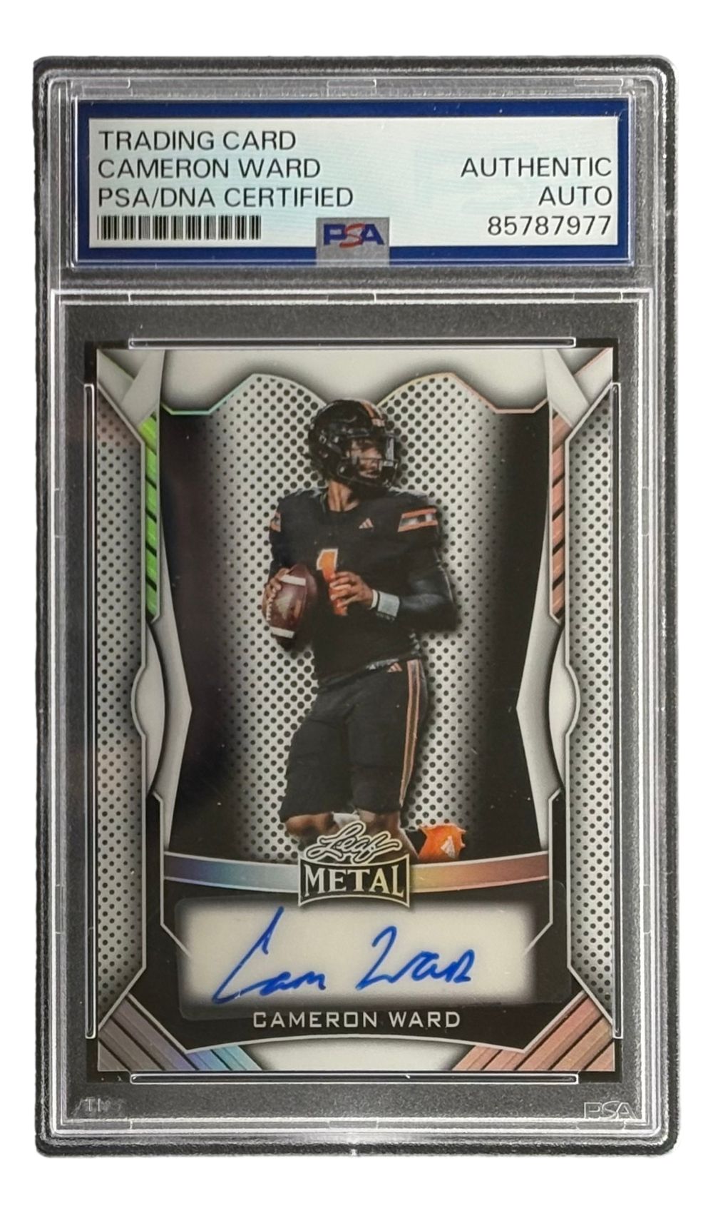 Featured is a Cam Ward signed 2025 Leaf Metal #MA-CW2 rookie trading card. This card has been hand signed by Ward and has been authenticated and encapsulated by PSA. This card would make a great addition to any sports memorabilia collection!.