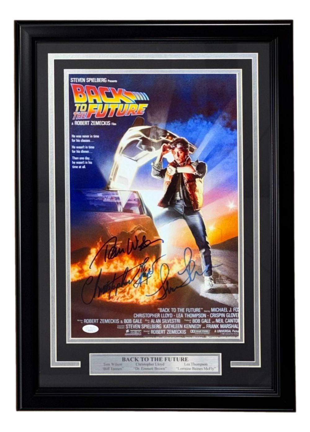 Featured is a Christopher Lloyd, Thomas Wilson, and Lea Thompson signed Back To The Future 11x17 photo. This photo was hand signed by Lloyd, Wilson and Thompson and comes with the JSA hologram and certificate of authenticity. This photo has been professionally framed and matted and is approximately 16x22. This photo would make a great addition to any entertainment memorabilia collection!.