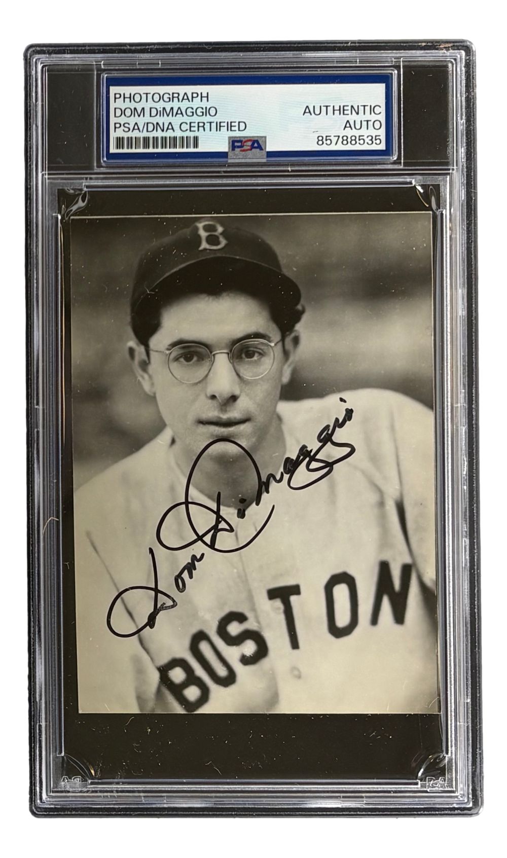 Featured is a Dom DiMaggio signed 4x6 Boston Red Sox photo. This photo has been hand signed by DiMaggio and has been authenticated and encapsulated by PSA/DNA. This photo would make a great addition to any sports memorabilia collection!.