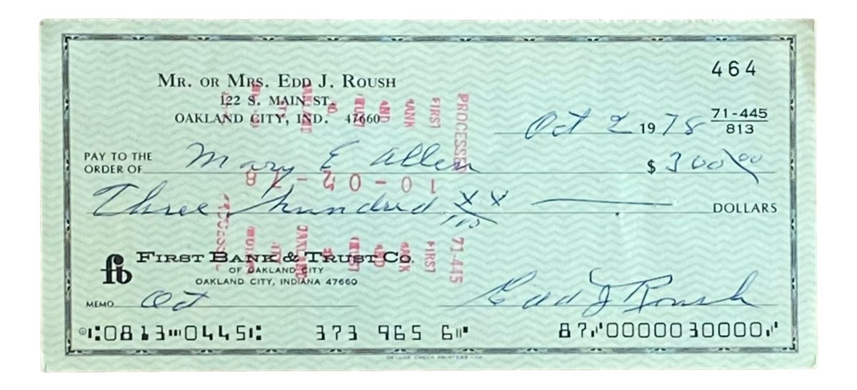 Edd Roush Cincinnati Reds Signed Bank Check #464 BAS