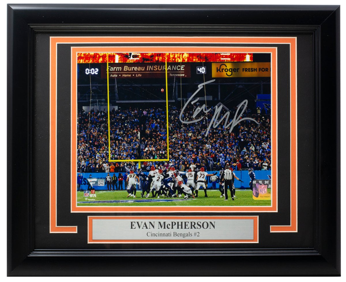 Featured is an Evan McPherson signed and framed 8x10 Cincinnati Bengals game winning kick photo. This photo was hand signed by Evan McPherson. and has been authenticated by Fanatics authentication services. Included with the photo is a Fanatics hologram and certificate of authentication. Brand new professional framing featuring double matting and engraved nameplate. The frame measures approximately 14x11 in total size, and it is ready for display. This item would make a great addition to any sports memorabilia collection.