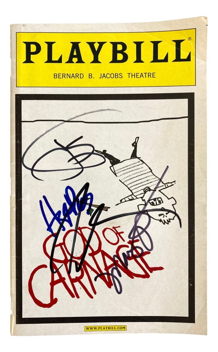Featured is a God Of Carnage cast signed Playbill program. This program has been hand signed by James Gandolfini, Jeff Daniels, Hope Davis, and Marcia Gay Harden. This program comes with the Beckett hologram and letter of authenticity. This program would make a great addition to any entertainment memorabilia collection!.