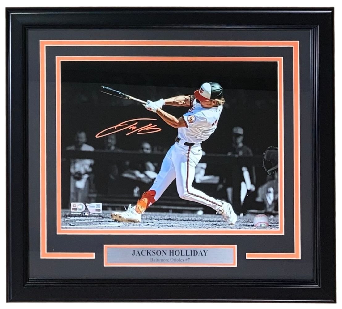 Featured is a Jackson Holiday signed 11x14 Baltimore Orioles photo. This photo has been hand signed by Holiday and comes with the Fanatics hologram and certificate of authenticity. This photo has been professionally framed and matted and is approximately 16x20. This photo would make a great addition to any sports memorabilia collection..