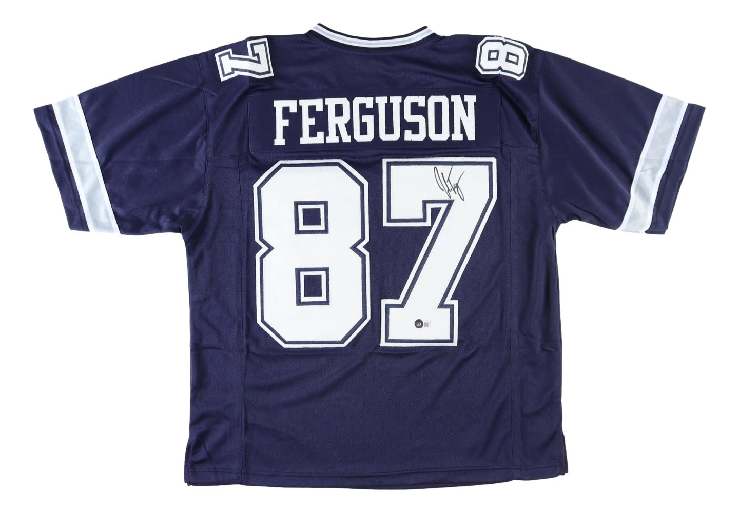 Featured is a Jake Ferguson signed custom football jersey. This jersey has been hand signed by Ferguson and comes with the Beckett witnessed hologram and certificate of authenticity. This jersey features professionally sewn letters and numbers and is size XL. This jersey has no team tags or emblems and is intended as a sports collectible. This jersey would make a great addition to any sports memorabilia collection!.