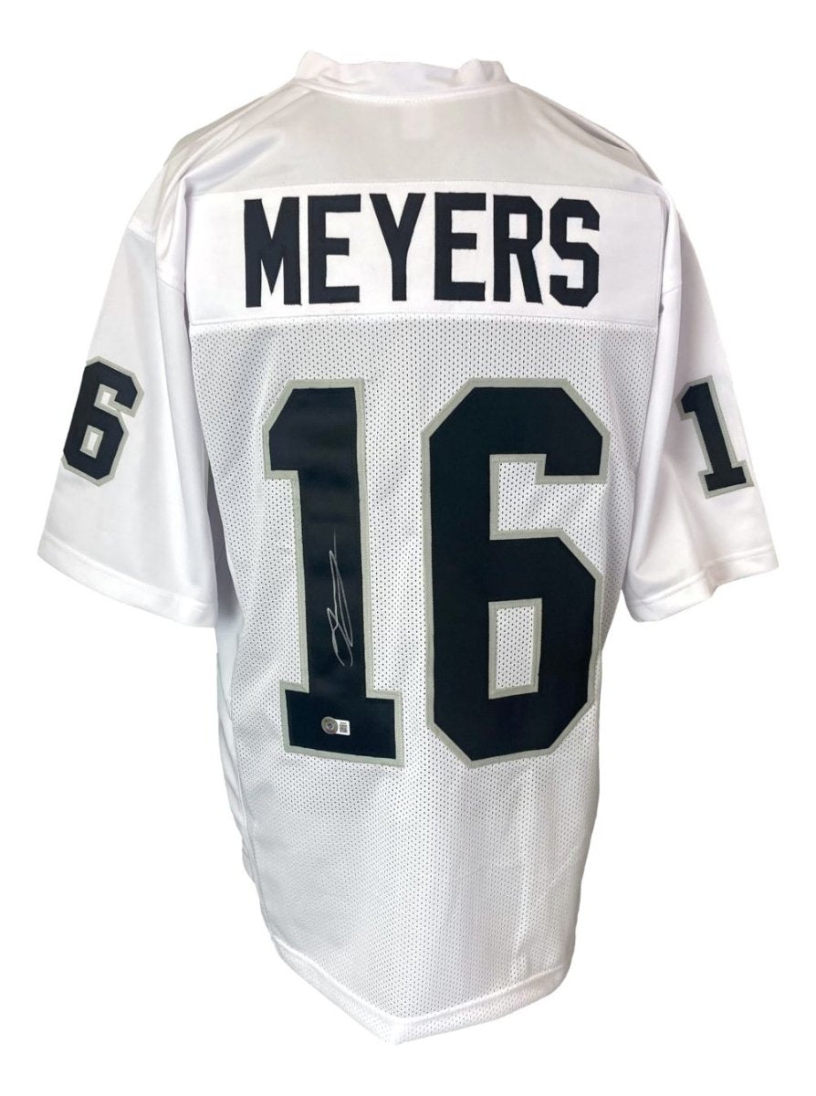 Featured is a Jakobi Meyers signed custom football jersey. This jersey has been hand signed by Meyers and comes with the Beckett witnessed hologram and certificate of authenticity. This jersey features professionally sewn letters and numbers and is size XL. This jersey has no team tags or emblems and is intended as a sports collectible..