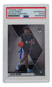 Featured is a Jalen Green signed 2021 Panini Chronicles Mosaic Draft Picks silver rookie basketball card #254. This card has been slabbed and authenticated by PSA authentication services giving the autograph a Gem Mint 10 grading. This card would make a great addition to any sports memorabilia collection!..