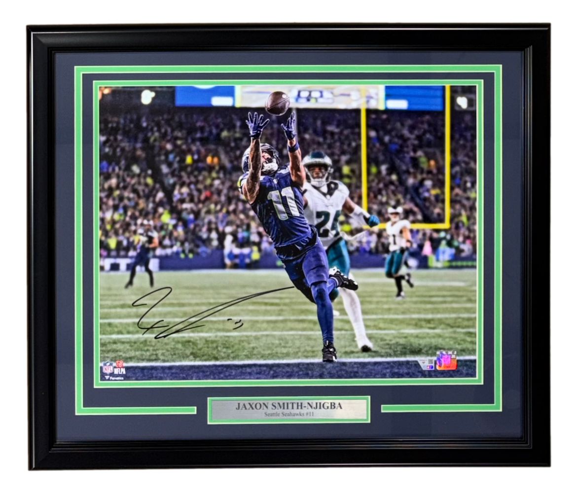 Featured is a Jaxon Smith-Njigba signed 16x20 Seattle Seahawks photo. This photo has been hand signed by Smith-Njigba and comes with the Fanatics hologram. This photo has been professionally framed and matted and is approximately 22x27. This photo would make a great addition to any sports memorabilia collection!.