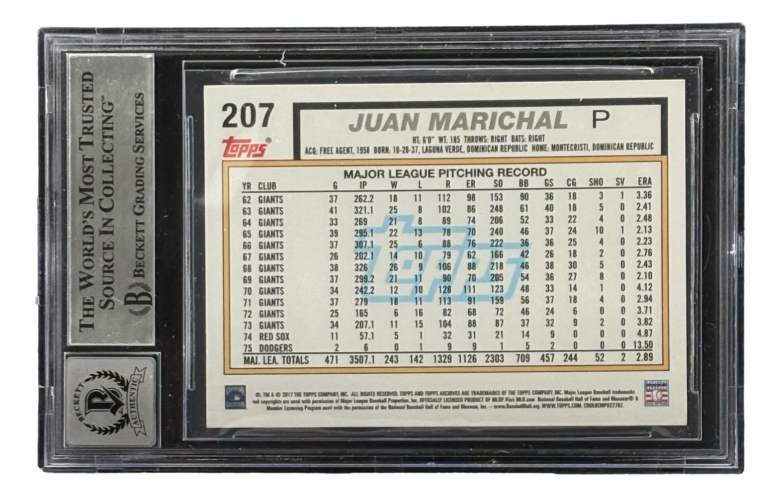 Featured is a Juan Marichal signed 2017 Topps #207 trading card. This card has been hand signed by Marichal and has been authenticated and encapsulated by Beckett, receiving an autograph grade of 10. This card would make a great addition to any sports memorabilia collection.