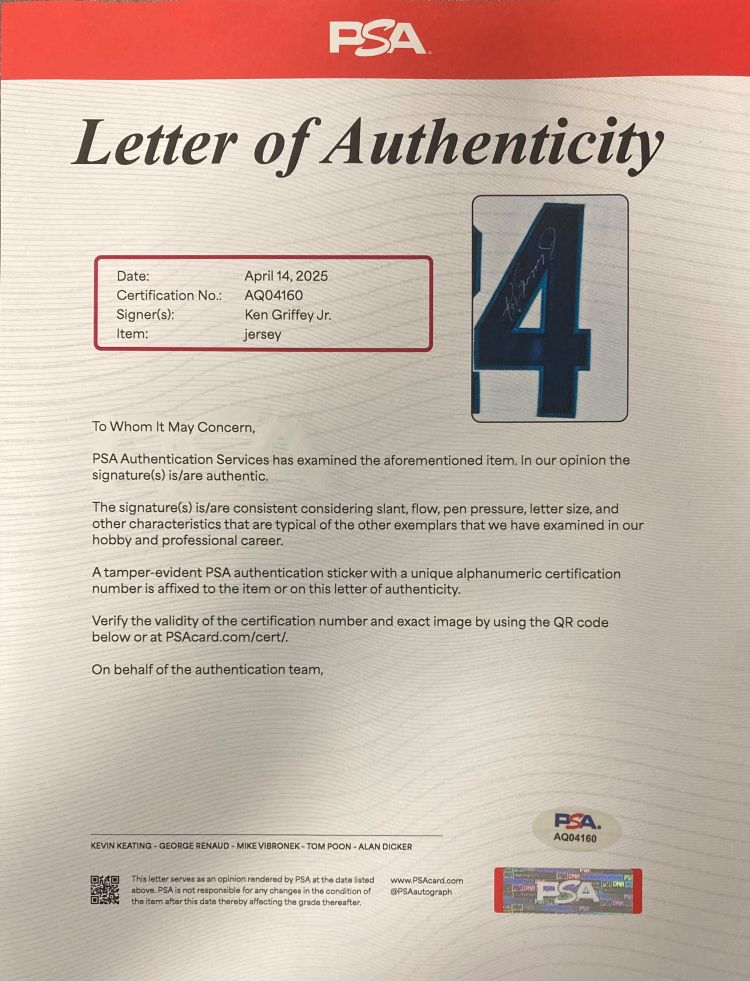 Featured is a Ken Griffey Jr. signed Seattle Mariners Russell Athletic authentic baseball jersey. This jersey has been hand signed by Griffey and comes with the Beckett and PSA/DNA holograms and letters of authenticity. This jersey is size 48. This jersey would make a great addition to any sports memorabilia collection..