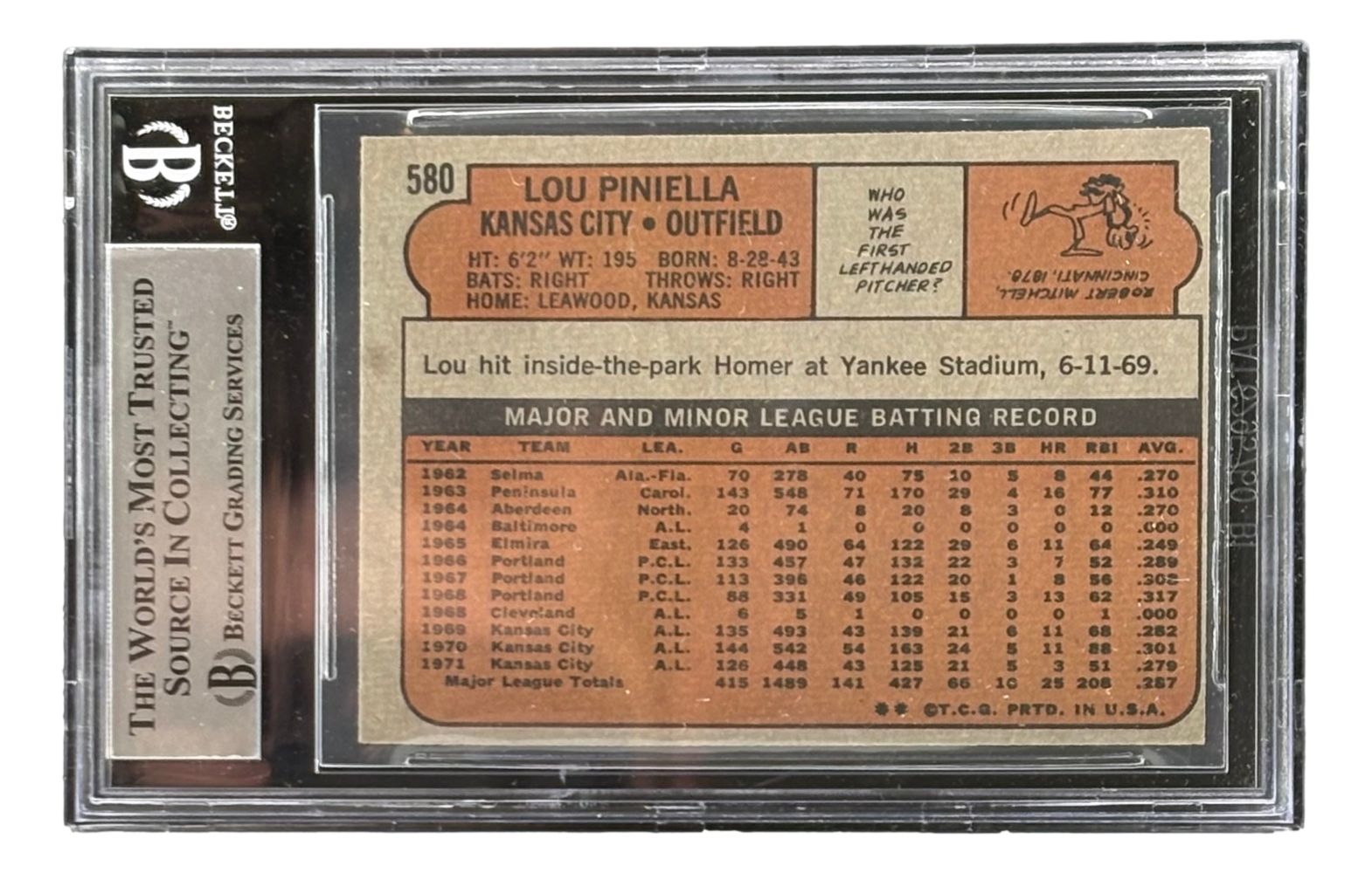 Featured is a Lou Piniella signed 1972 Topps #580 trading card. This card has been hand signed by Piniella and has been authenticated and encapsulated by Beckett. This card would make a great addition to any sports memorabilia collection. **Stock image used.**