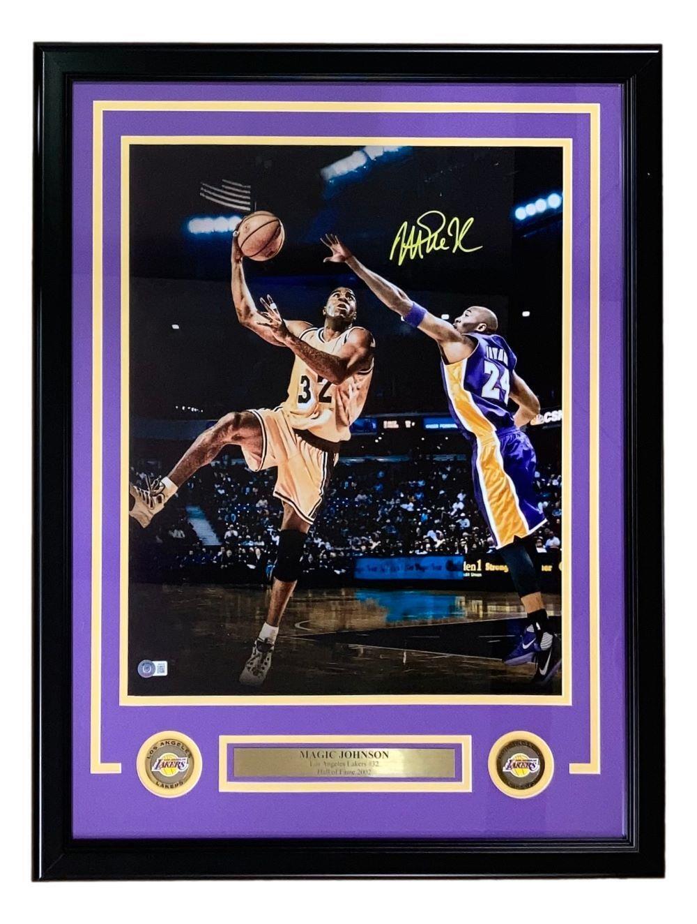 Featured is a Magic Johnson signed 16x20 Los Angeles Lakers basketball photo. This photo was signed by Johnson and comes with the Beckett hologram and certificate of authenticity. This photo has been professionally framed and matted and is approximately 22x27. This photo would make a great addition to any sports memorabilia collection!.
