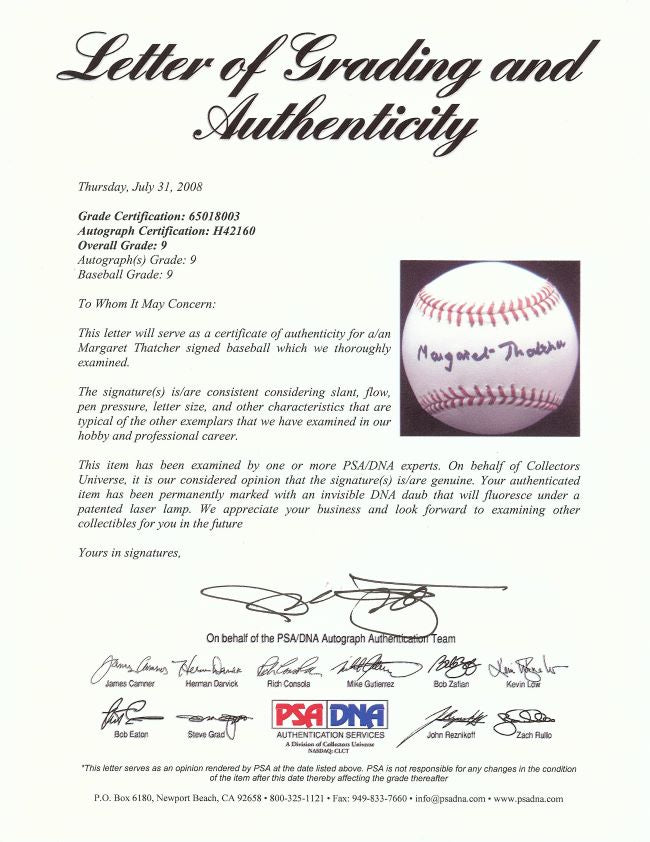 Featured is a Margaret Thatcher signed official MLB baseball. This ball has been hand signed by Thatcher and comes with the PSA hologram and letter of authenticity. This ball received an overall grade of 9 for both autograph and condition. This ball would make a great addition to any sports memorabilia collection!.