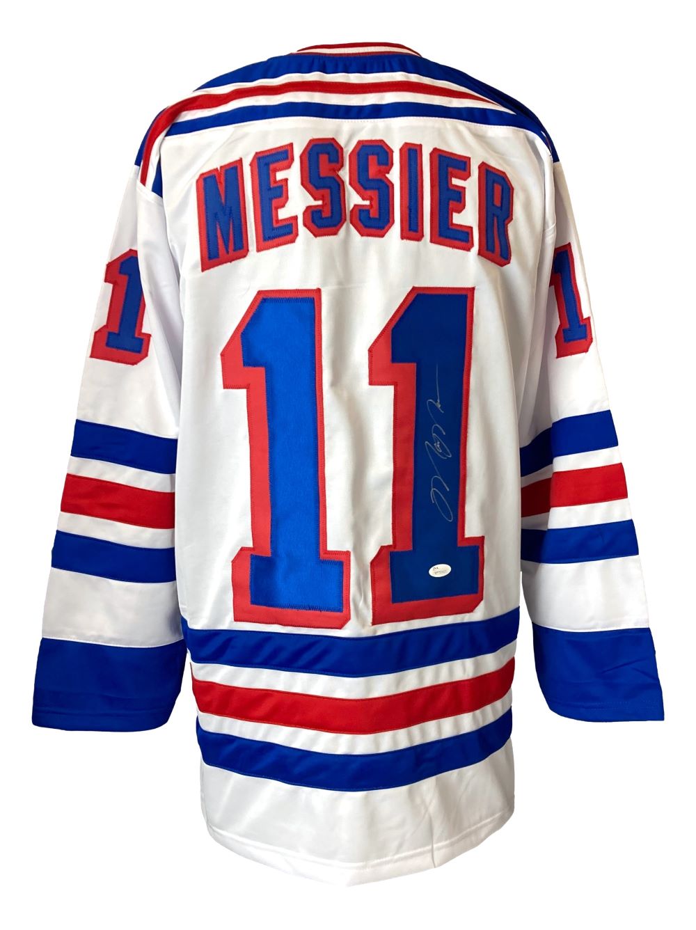Featured is a Mark Messier signed custom hockey jersey. This jersey has been hand signed by Messier and comes with the JSA hologram and certificate of authenticity. This jersey features professionally sewn letters and numbers and is size XL. This jersey has no team tags or emblems and is intended as a sports collectible. This jersey would make a great addition to any sports memorabilia collection!