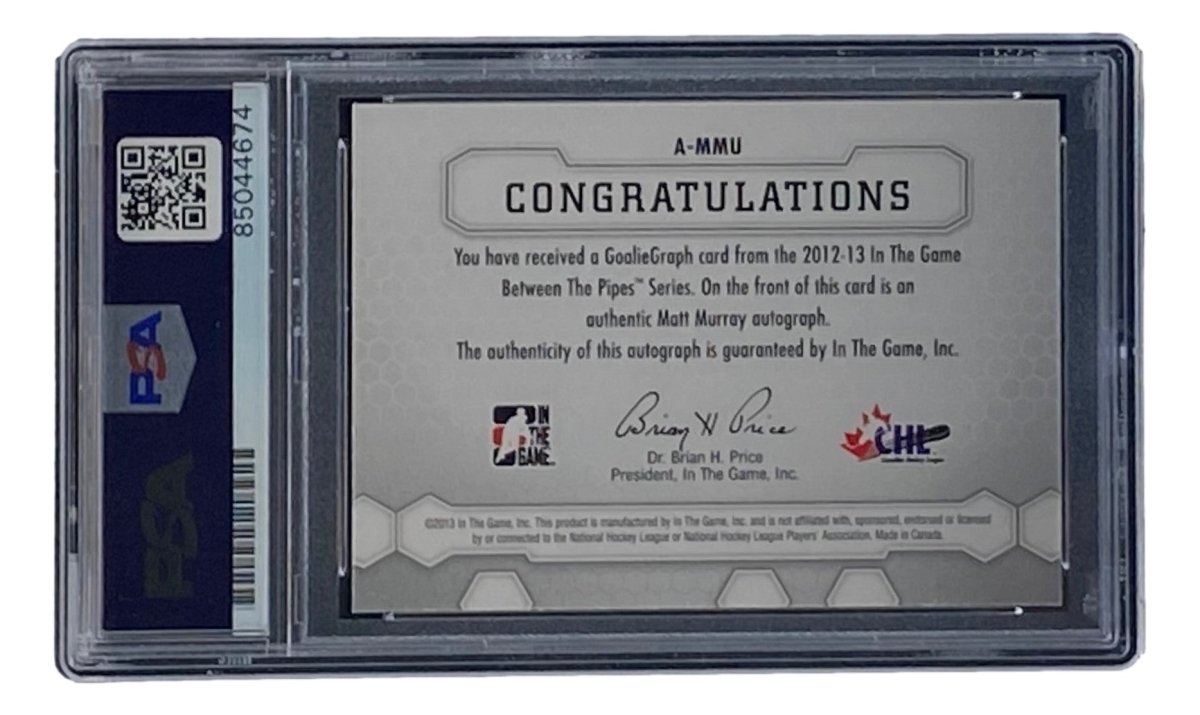 Featured is a Matt Murray signed 2013 In The Game #A-MMU Pittsburgh Penguins trading card. This card has been hand signed by Murray and has been authenticated and encapsulated by PSA. This card would make a great addition to any sports memorabilia collection!.