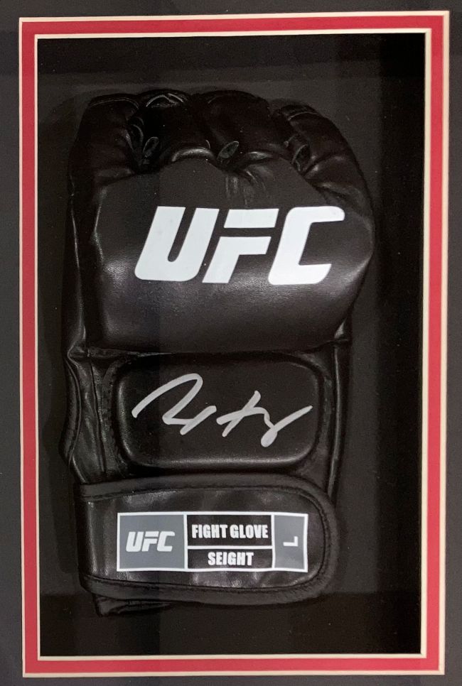 Featured is a Max Holloway signed UFC replica fight glove. This glove has been hand signed by Holloway and comes with the Beckett hologram (back of glove) and certificate of authenticity. This jersey would make a great addition to any sports memorabilia collection. This glove has been professionally framed and matted and is approximately 16x22. **Please note: Stock image used. Glove hand may vary.**.