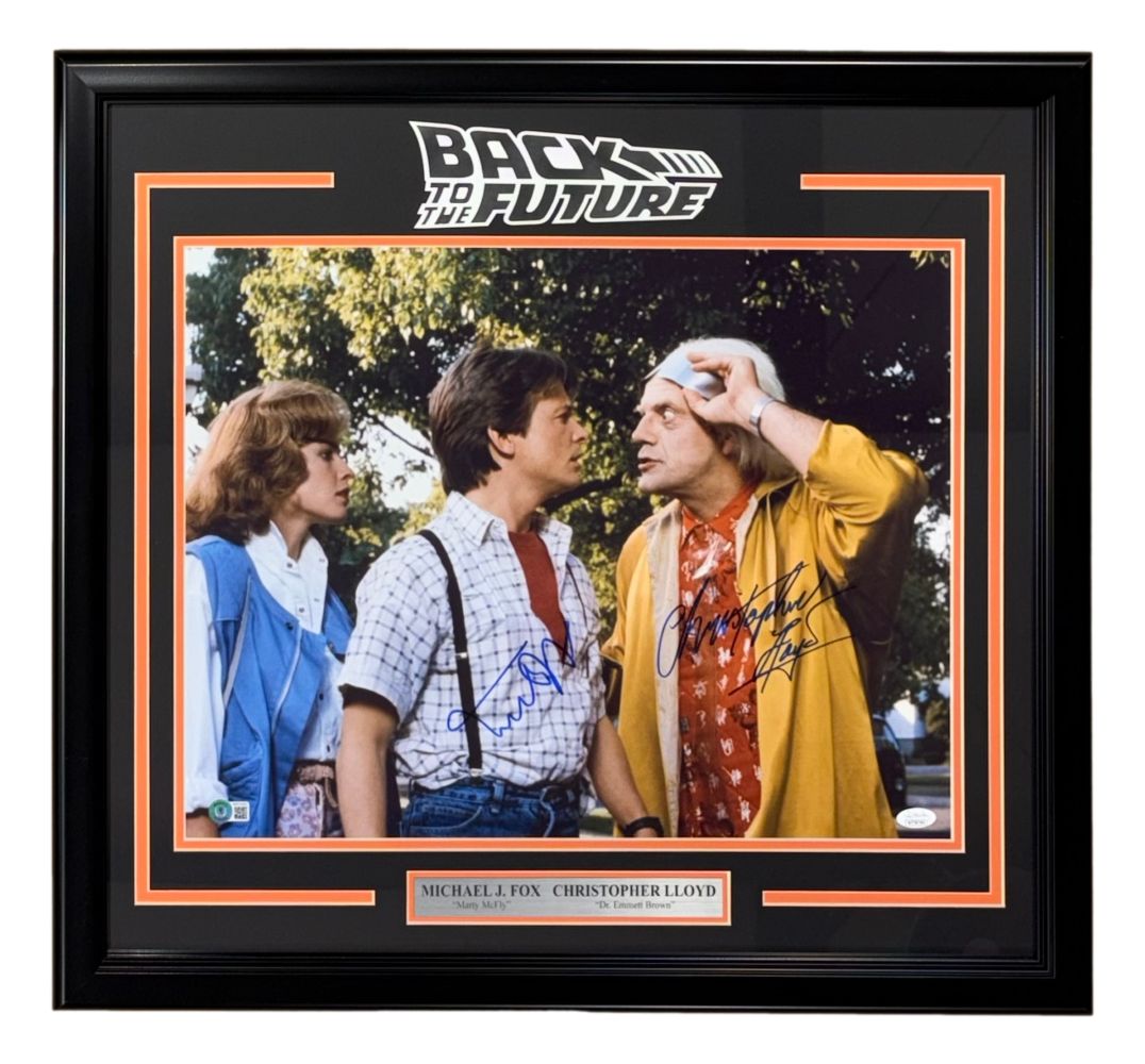 Featured is a Michael J. Fox and Christopher Lloyd signed 16x20 Back To The Future photo. This photo was hand signed by Michael J. Fox and Christopher Lloyd and comes with the Beckett (Fox) and JSA (Lloyd) hologram and certificate of authentications. This photo has been professionally framed and matted and is approximately 24x30..