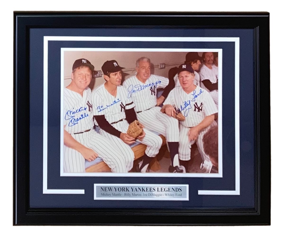 Featured is a Mickey Mantle, Joe DiMaggio, Billy Martin and Whitey Ford signed 11x14 New York Yankees photo. This photo has been hand signed by Mantle, DiMaggio, Martin and Ford and comes with the JSA hologram and letter of authenticity. This photo has been professionally framed and matted and is approximately 16x20. This photo would make a great addition to any sports memorabilia collection.