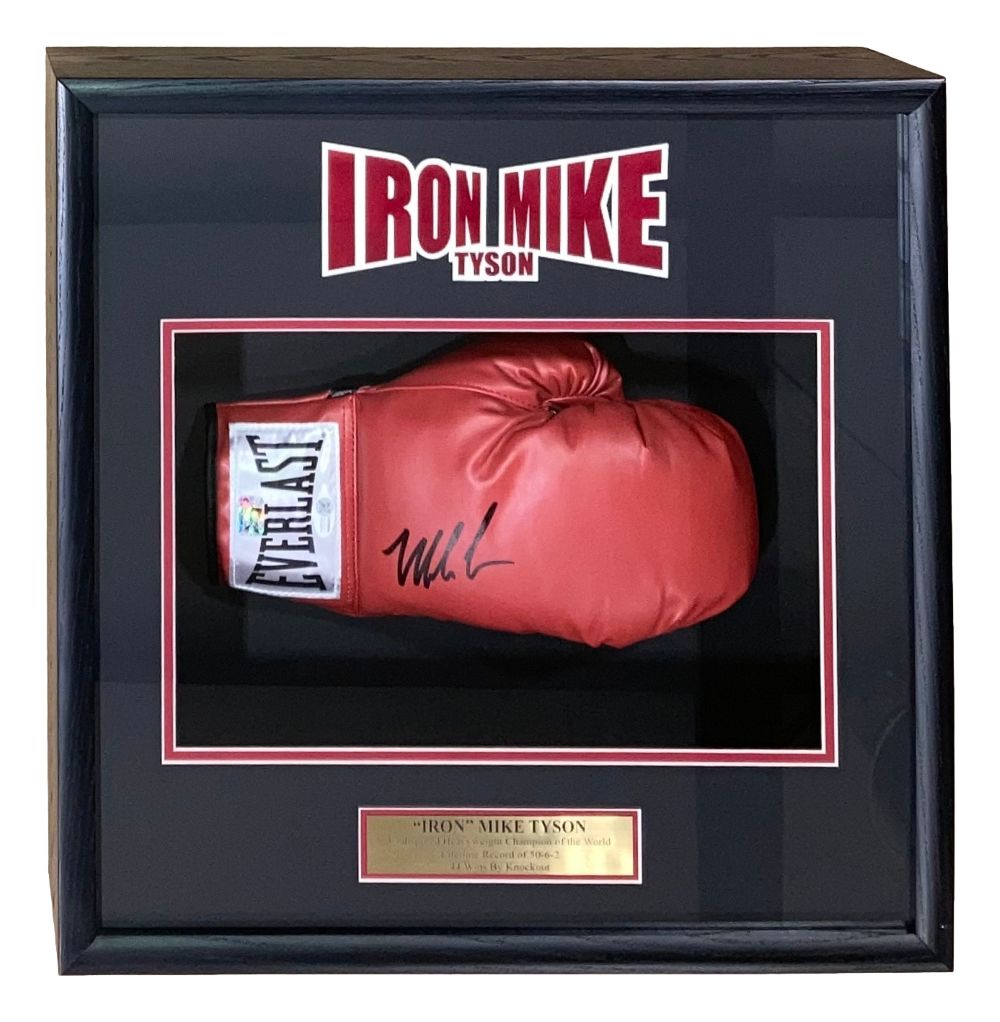 Featured is a Mike Tyson signed Everlast boxing glove. This glove has been hand signed signed by Tyson and comes with the JSA hologram. This glove has been professionally framed in a shadow box and is approximately 18x19x4. This glove would make a great addition to any sports memorabilia collection!