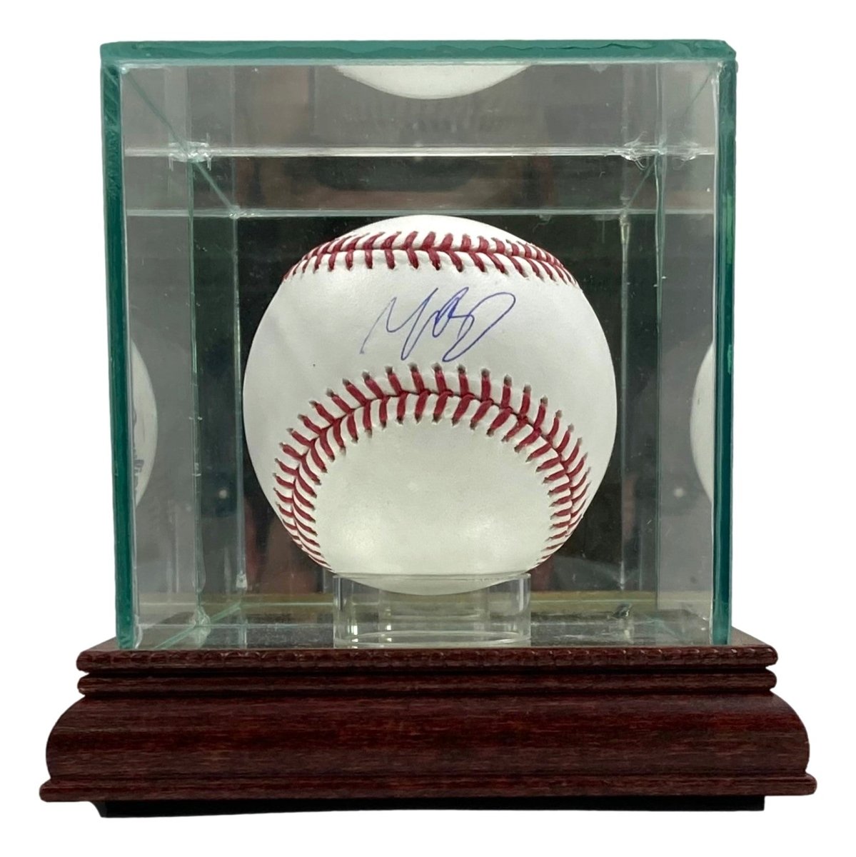 Featured is a Mookie Betts signed official MLB baseball. This ball has been hand signed by Betts and comes with the JSA hologram and certificate of authenticity. With this ball you will be receiving a glass display case that features a cherry wood base and mirrored bottom. This ball would make a great addition to any sports memorabilia collection!.