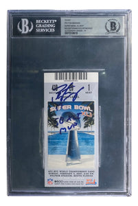 Featured is a Peyton Manning Indianapolis Colts signed Super Bowl XLI ticket, inscribed "SB XLI MVP". This ticket has been hand signed by Manning and has been authenticated and encapsulated by Beckett, receiving an autograph grade of 10. This ticket would make a great addition to any sports memorabilia collection!.