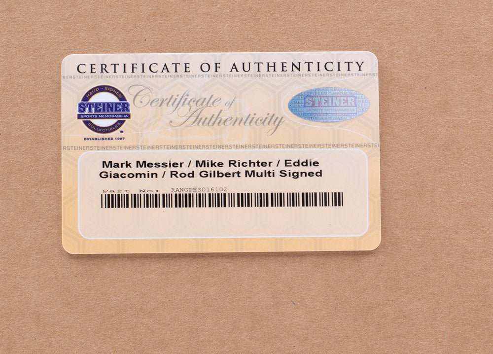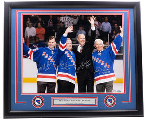 Featured is a Mike Richter Rod Gilbert Mark Messier and Ed Giacomin signed framed 16x20 New York Rangers photo. This photo was hand signed by Mike Richter Rod Gilbert Mark Messier and Ed Giacomin and has been authenticated by Fanatics authentication services. Included with the photo is a Fanatics hologram and certificate of authenticity. Brand new professional framing featuring double matting and engraved nameplate. The frame measures approximately 22x27 in total size, and it is ready for display. This item would make a great addition to any sports memorabilia collection..