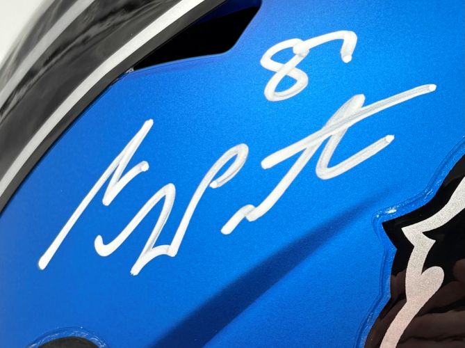 Featured is a Sam LaPorta signed Detroit Lions full size speed replica helmet. This helmet has been hand signed by LaPorta and comes with the Beckett hologram and certificate of authenticity. Included with this helmet is a deluxe acrylic display case. This helmet would make a great addition to any sports collection!.