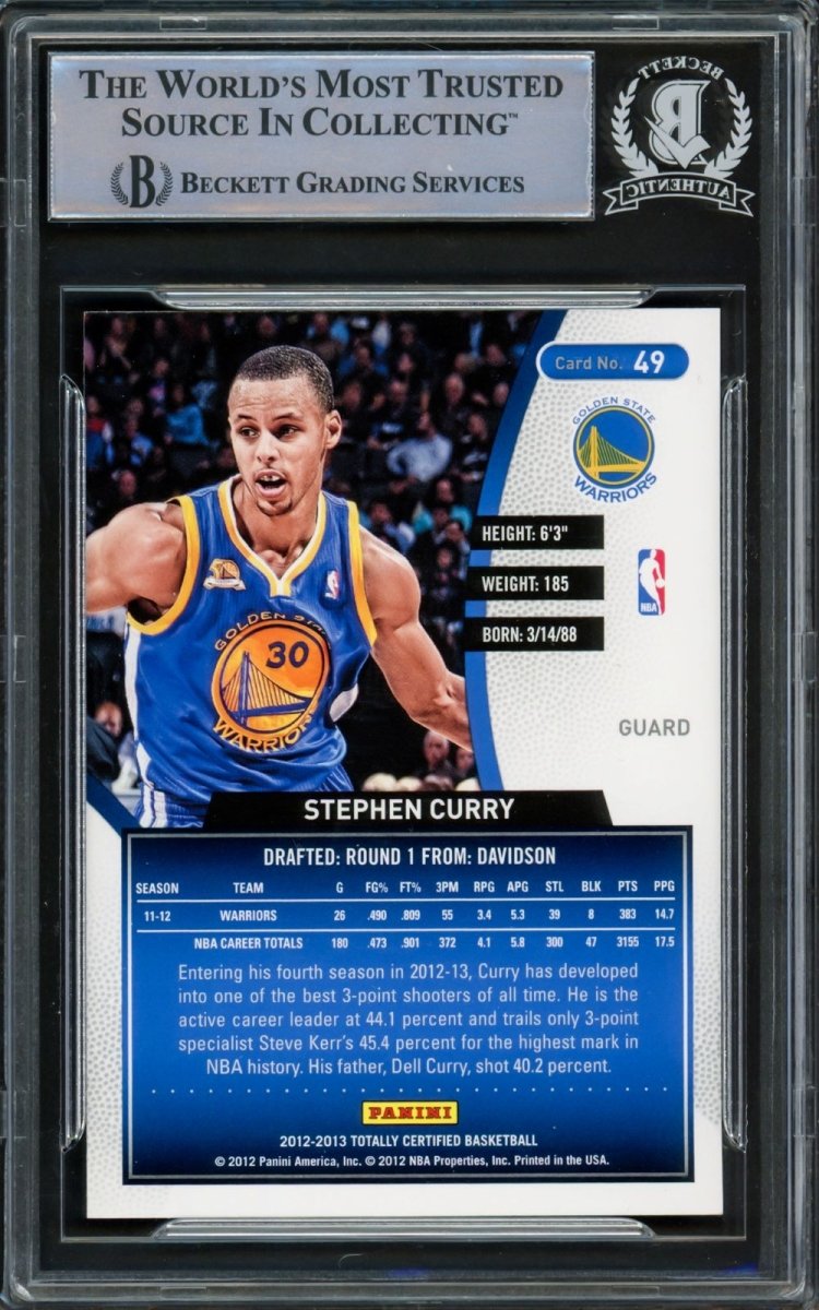 Featured is a Stephen Curry signed 2012-13 Panini Totally Certified #49 trading card. This card has been hand signed by Curry and has been authenticated and encapsulated by Beckett. This card would make a great addition to any sports memorabilia collection! **Please note: Stock Image used.**.