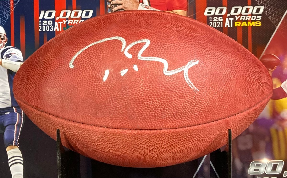 Featured is a Tom Brady signed New England Patriots Wilson Duke football. This football was signed by Brady and comes with the Fanatics hologram and certificate of authenticity. Included with this football is a Tom Brady collage shadowbox. This shadowbox measures approximately 21x24. This ball would make a great addition to any sports memorabilia collection!.