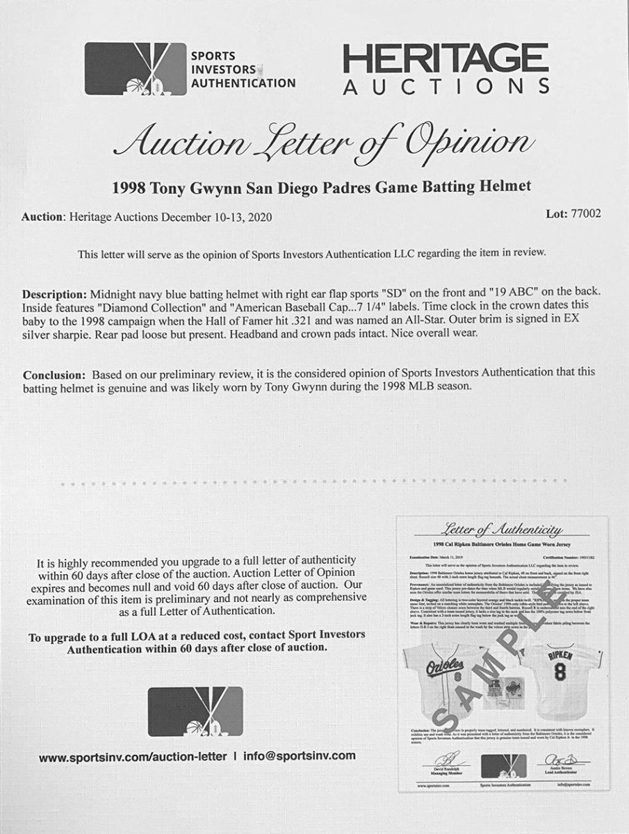 Featured is a Tony Gwynn signed, game used 1998 San Diego Padres batting helmet. This helmet has been hand signed by Gwynn and game used by during the 1998 season. The helmet has been comes with the by Beckett hologram and certificate of authenticity (for autograph), along with a copy of the Sports Investors letter of authenticity (for game used). This helmet would make a great addition to any sports memorabilia collection!.