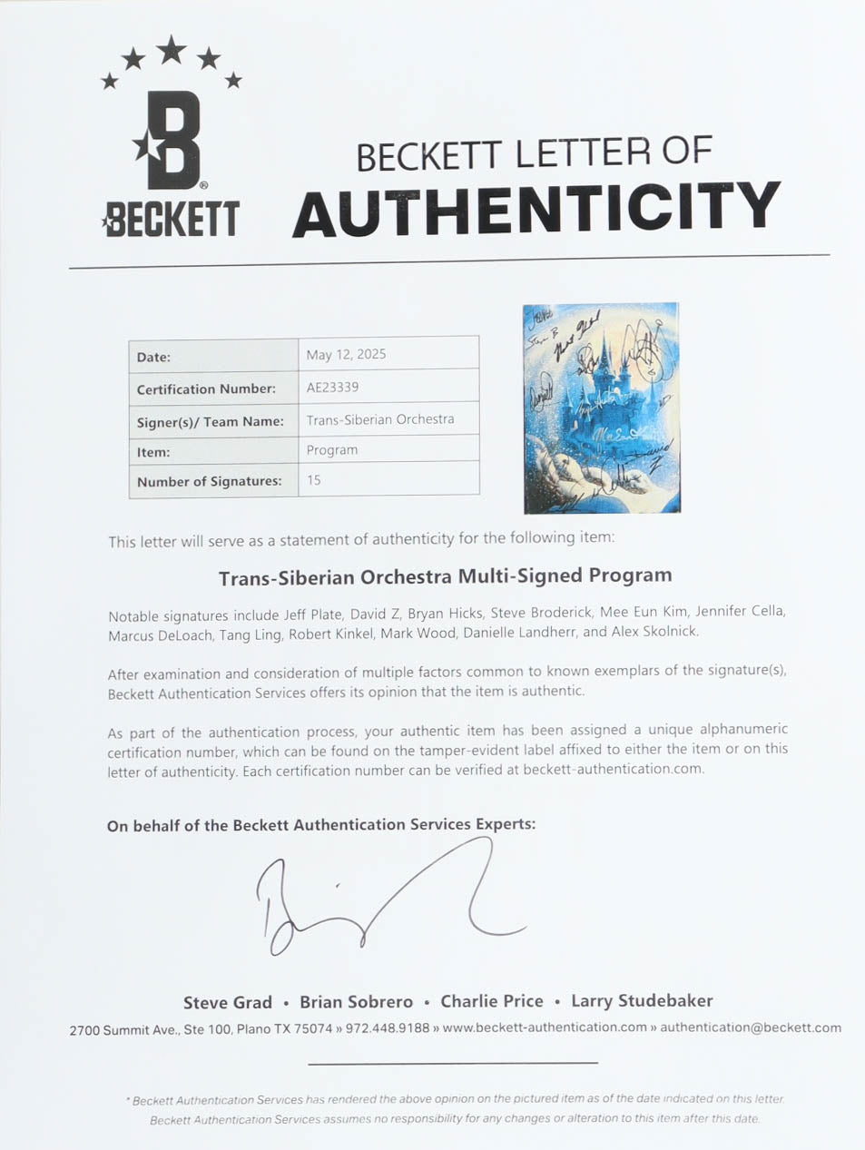 Featured is a Trans-Siberian Orchestra signed 2004 Winter Tour program. This program has been hand signed by Jeff Plate, David Z, Bryan Hicks, Steve Broderick, Mee Eun Kim, Jennifer Cella, Marcus DeLoach, Tang Ling, Robert Kinkel, Mark Wood, Danielle Landherr and Alex Skolnick and has comes with the Beckett hologram and letter of authenticity. This program would make a great addition to any entertainment memorabilia collection!..