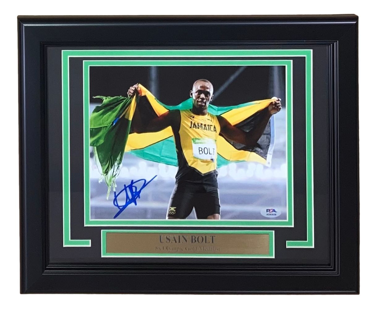 Featured is an Usain Bolt signed 8x10 Olympics photo. This photo has been hand signed by Bolt and comes with the PSA hologram. This photo has been professionally framed and matted and is approximately 11x14..