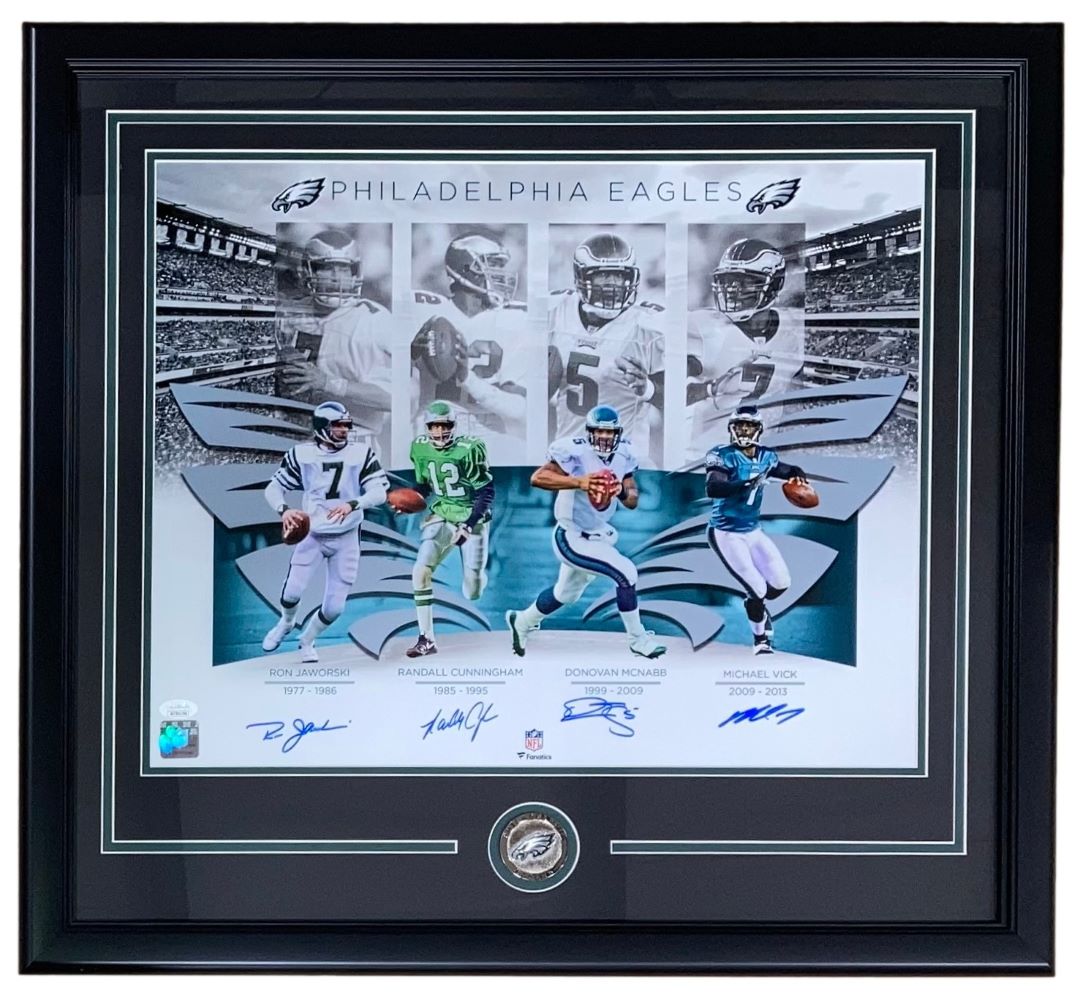 Featured is a Michael Vick, Donovan McNabb, Ron Jaworski, and Randall Cunningham signed 16x20 Philadelphia Eagles photo. This photo was hand signed and comes with the JSA hologram and certificate of authenticity. This photo has been professionally framed and matted and is approximately 22x27. This photo would make a great addition to any sports memorabilia collection!.