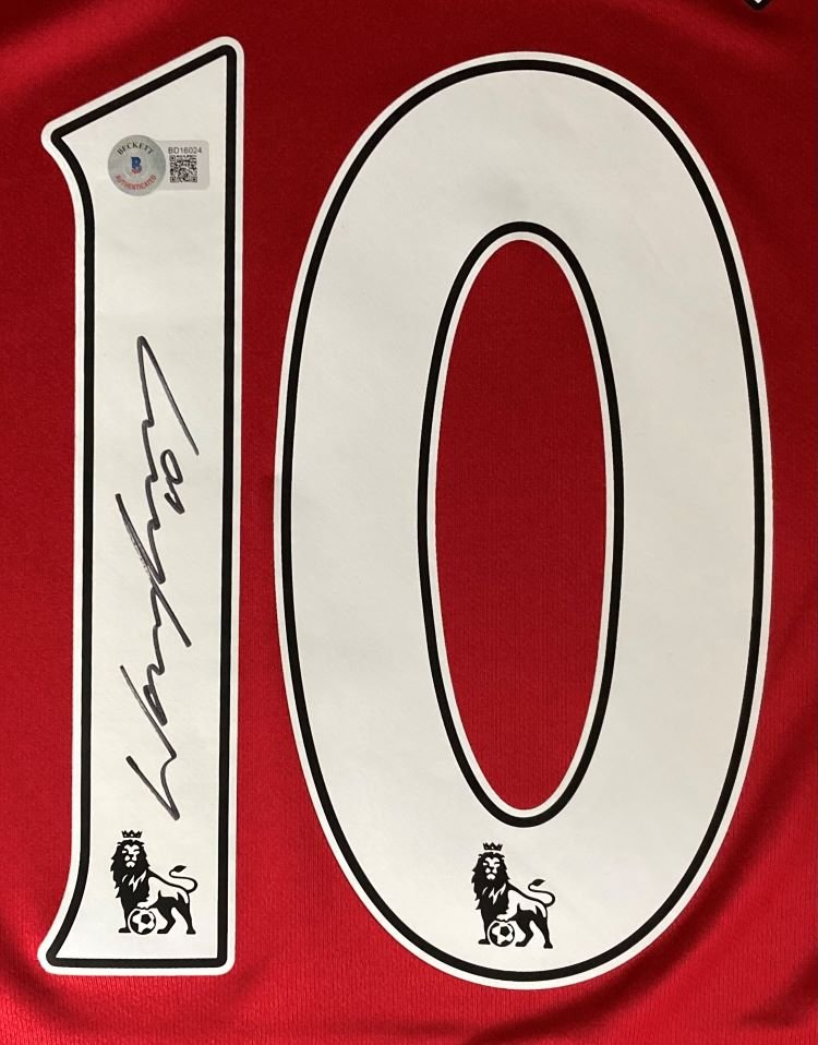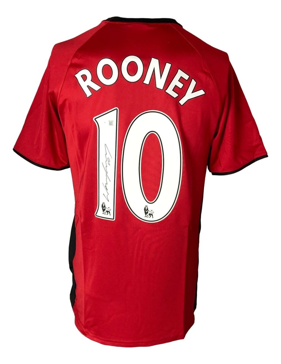 Featured is a Wayne Rooney signed custom soccer jersey. This jersey has been hand signed by Rooney and comes with the Beckett hologram and certificate of authenticity. This jersey features professionally sewn letters and numbers and is size XL. This jersey has no team tags or emblems and is intended as a sports collectible. This jersey would make a great addition to any sports memorabilia collection!.