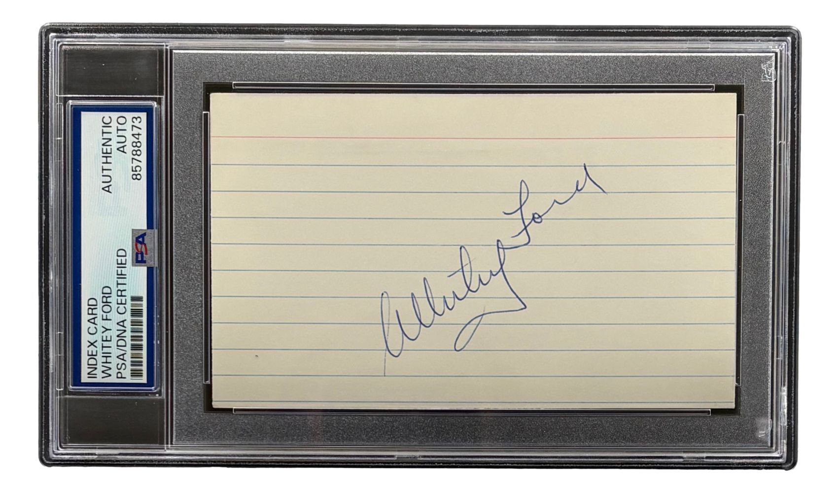 Featured is a Whitey Ford signed 3x5 index card. This card has been hand signed by Ford and has been authenticated and encapsulated by PSA/DNA. This card would make a great addition to any sports memorabilia collection!.