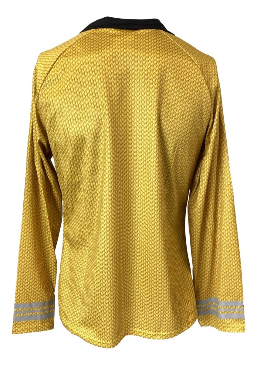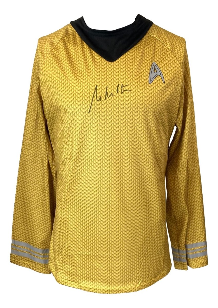 Featured is a William Shatner signed Captain Kirk costume shirt. This shirt has been hand signed by Shatner and comes with the JSA hologram and certificate of authenticity. This shirt is size L. This shirt would make a great addition to any entertainment memorabilia collection!.