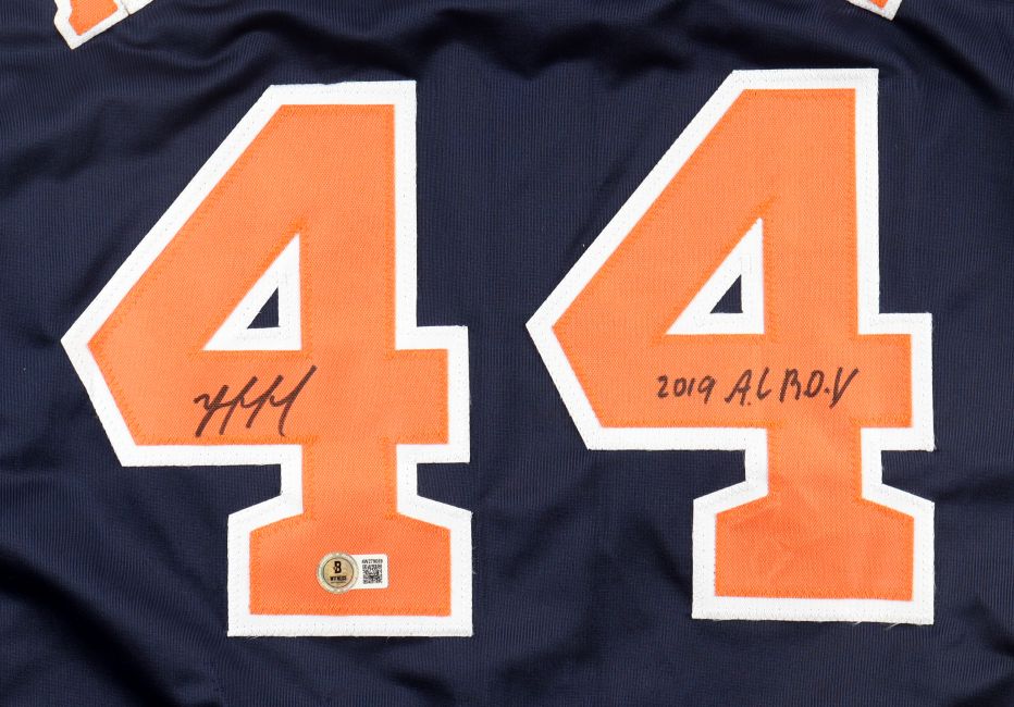 Featured is a Yordan Alvarez signed custom baseball jersey, inscribed "2019 AL ROY". This jersey has been hand signed by Alvarez and comes with the Beckett hologram and certificate of authenticity. This jersey features professionally sewn letters and numbers and is size XL. This jersey has no team tags or emblems and is intended as a sports collectible. This jersey would make a great addition to any sports memorabilia collection!.