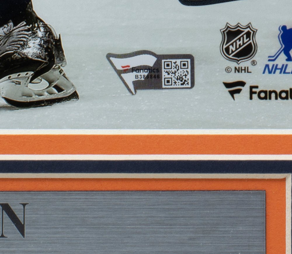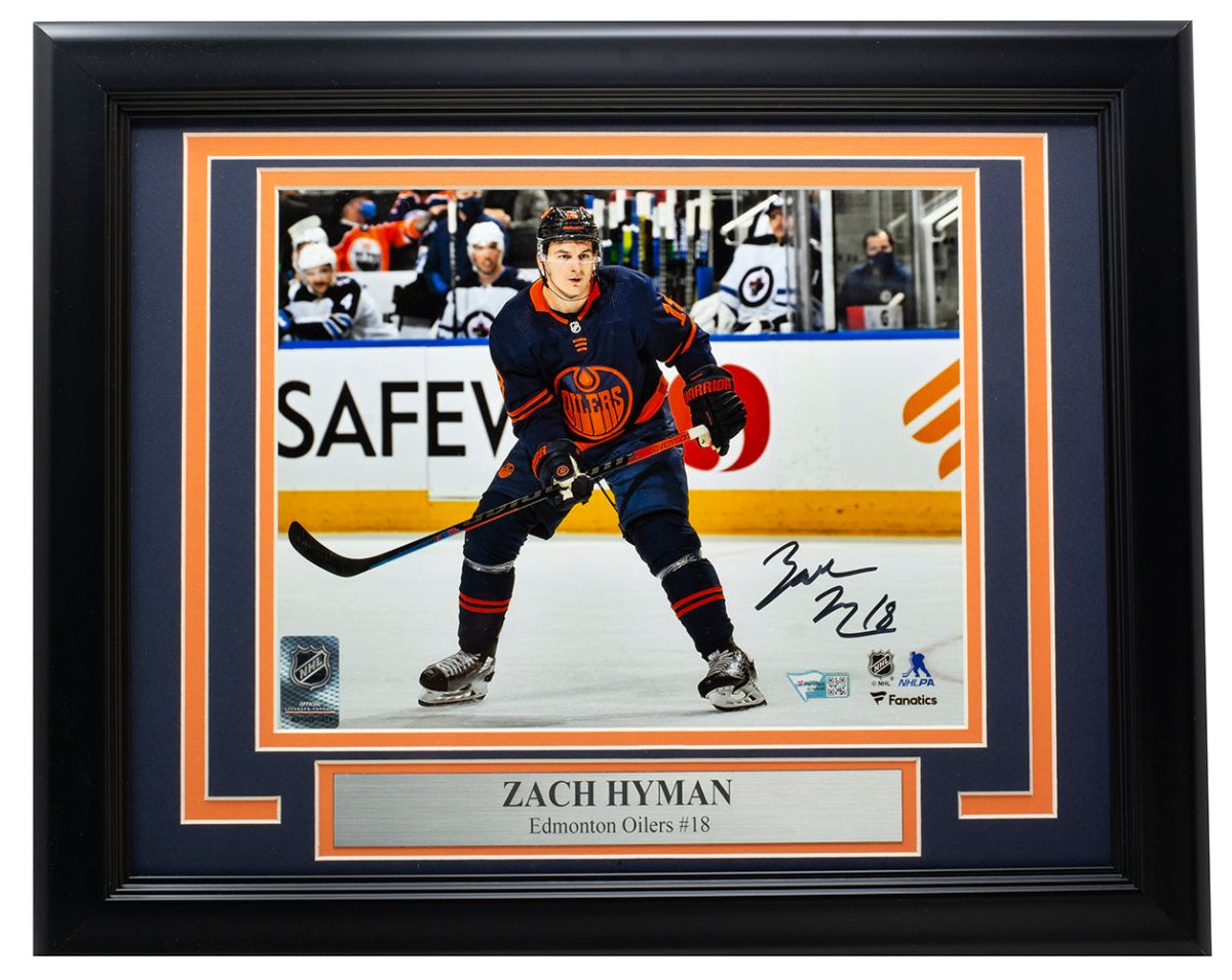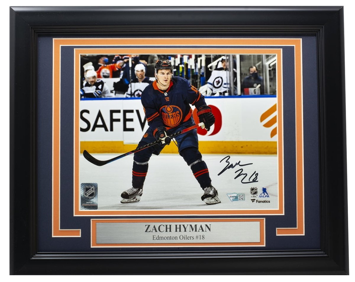 Featured is a Zach Hyman signed framed 8x10 Edmonton Oilers NHL photo. This photo was hand signed by Zach Hyman and has been authenticated by Fanatics authentication services. Included with the photo is a Fanatics hologram and certificate of authentication. Brand new professional framing featuring double matting and an engraved nameplate. The frame measures approximately 11x14 in total size and it is ready for display. This photo would make a great addition to any sports memorabilia collection..