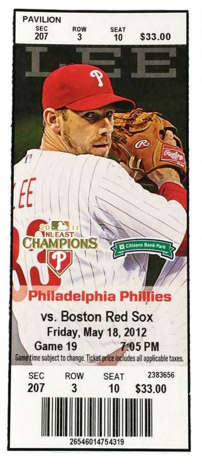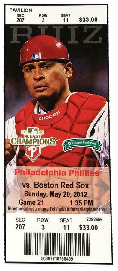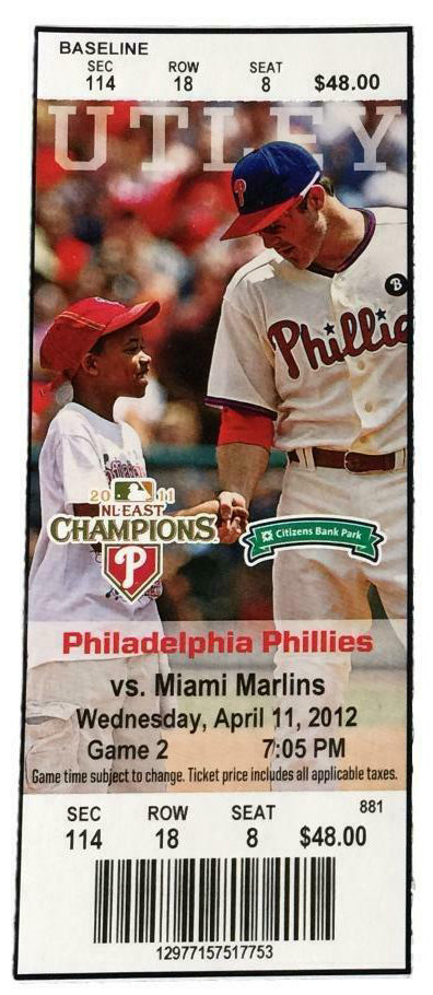 Featured is a 2012 Phillies lot of three game tickets. These tickets are from April 11, May 18, and May 20. On April 11, the Phillies defeated the Marlins 7-1. On May 18, the Phillies defeated the 6-4. On May 20, the defeated the Phillies 5-1..
