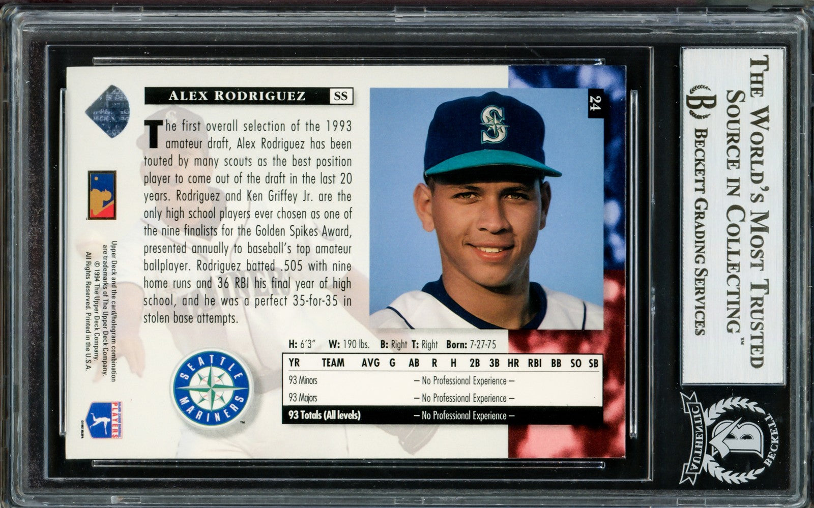 Featured is an Alex Rodriguez signed 1994 Upper Deck #24 rookie card. This card has been hand signed by Rodriguez and has been encapsulated and authenticated by Beckett. This card would make a great addition to any sports memorabilia collection! Stock image used.