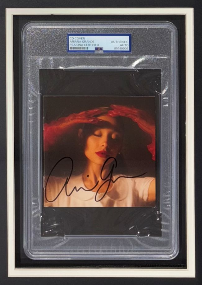 Featured is an Ariana Grande signed Eternal Sunshine CD insert. This insert has been hand signed by Grande and has been authenticated and encapsulated by PSA. This photo has been professionally framed and matted with an 11x14 photo and is approximately 20x30. This insert would make a great addition to any entertainment memorabilia collection!