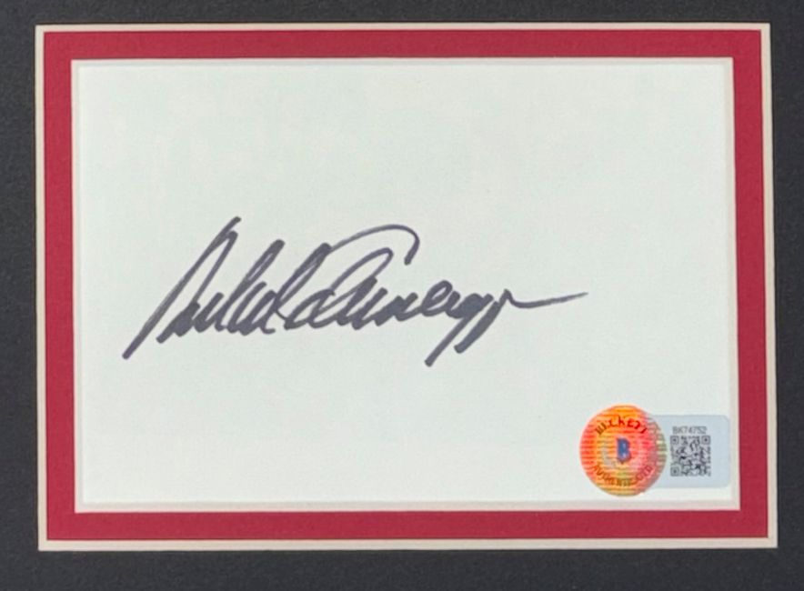 Featured is an Arnold Schwarzenegger signed cut signature. This cut has been hand signed by Schwarzenegger and comes with the Beckett hologram and letter of authenticity. This cut has been professionally framed and matted with an 8x10 photo and is approximately 15x22. This cut would make a great addition to any entertainment memorabilia collection!.