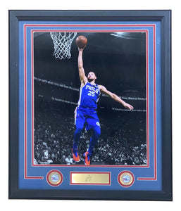 Featured is a Ben Simmons 16x20 Philadelphia 76ers photo. This photo has been professionally framed and matted and features a laser engraved signature. This frame size is approximately 22x27..