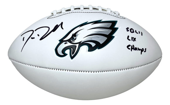 Featured is a Dom DiSandro signed Philadelphia Eagles logo football, inscribed "SB LII, LIX Champs". This football has been hand signed by DiSandro and comes with the Beckett hologram and certificate of authenticity. This football would make a great addition to any sports memorabilia collection!.