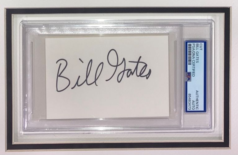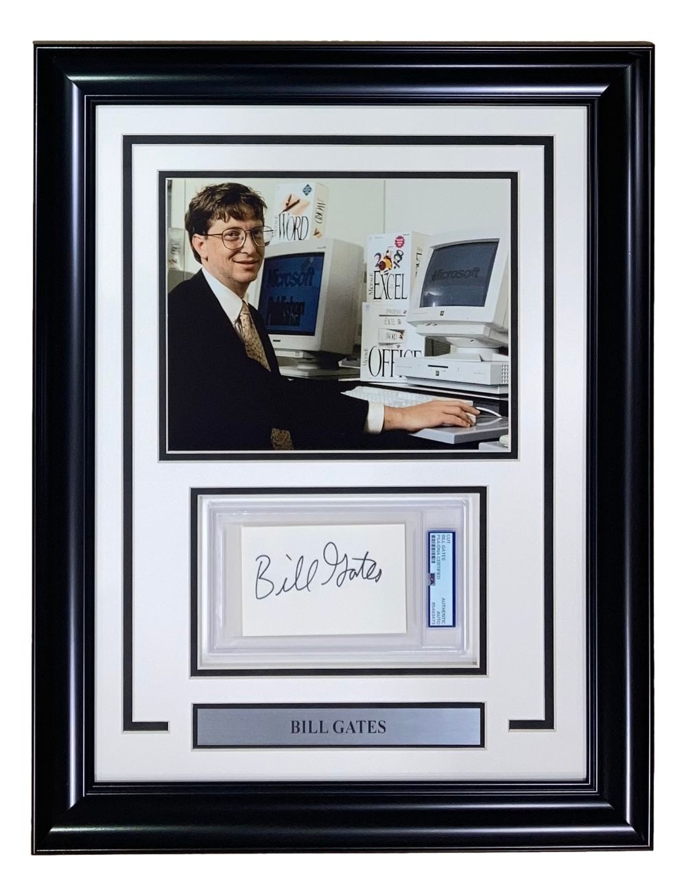 Featured is a Bill Gates signed signature cut. This cut has been hand signed by Gates and has been authenticated and encapsulated by PSA. This cut has been professionally framed and matted with an 8x10 photo and is approximately 18x23. This cut would make a great addition to any entertainment memorabilia collection!