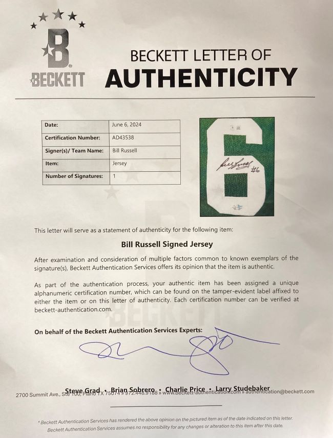 Featured is a Bill Russell signed custom basketball jersey. This jersey was hand signed by Russell and comes with the Beckett hologram and letter of authenticity. This jersey features professionally sewn letters and numbers and is size XL. This jersey has no team tags or emblems and is intended as a sports collectible..